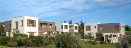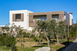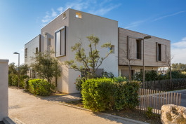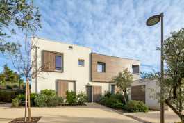 Chaque logement possède un espace extérieur soit par un principe de loggia protégée pour le confort d’été soit par des jardins en prolongation des séjours du RDC. Chaque «villa» est fragmentée grâce à l’utilisation de 2 matériaux différents le bois et l’enduit. Un principe d’emboîtement permet de fractionner la volumétrie. Les toitures terrasses sont plantées en grande partie pour favoriser la rétention d’eau et le confort thermique des logements en étage. Les espaces extérieurs sont aménagés avec le maintient des oliviers existants sur la parcelle et par la création de haies au végétal méditerranéen.