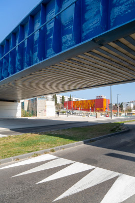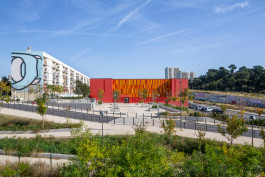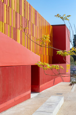 La Plaine Sportive, grand parc paysagé doit être aménagée entre la couverture de la L2, le centre commercial du Merlan et l’Agora. Ces nouveaux aménagements ont amené la Ville de Marseille, propriétaire du bâtiment, à repenser ses accès et ses façades pour l’intégrer dans ce nouvel environnement comme équipement central du quartier. Le caractère « signal » du bâtiment, véritable point de repère dans le quartier est créé par sa couleur rouge. Cette caractéristique, sera conservée comme base chromatique pour la réfection des façades. L’ancienne façade arrière devient la façade principale du bâtiment, sa composition sera enrichie par un jeu de panneaux en tôle perforée dans un camaïeu de couleur chaude ayant un rôle de brises soleil.