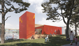 Le bâtiment en structure modulaire en bois est conçu comme un signal dans le quartier et se démarque par rapport à son environnement par son volume extrait de la pente et sa couleur rouge.